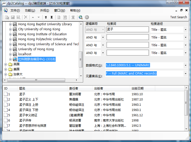 中国社会科学院联合编目中心所推荐的编目前端软件。通过dp2Catalog前端软件以及其他支持Z39.50协议的软件,您可以免费获取该编目中心内数量巨大的编目数据。